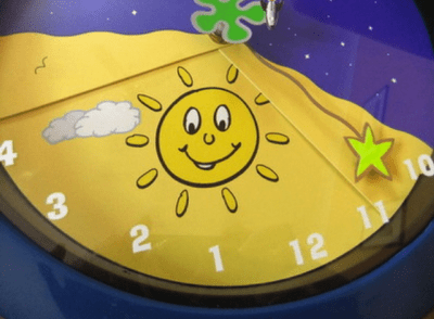 So, he cobbled together a number of clock parts to make a 24-hour one that split the face into a yellow-coloured day section and a dark blue night section. The difference between night and day was clearly indicated by the position of a star-tipped hour hand. To finish off, Mark gave the clock a mechanism, allowing parents to adjust the size of the night and day period.
